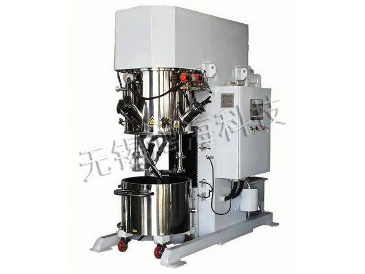 行星混合機(jī)由兩組攪拌槳和一組高速分散軸圍繞料桶軸線公轉(zhuǎn)的同時高速自轉(zhuǎn),從而使物料受到強(qiáng)烈的剪切、捏合作用,達(dá)到快速混合的目的;攪拌槳有槳葉式、麻花式、爪式、框式等多種形式,針對不同粘度、比重的物料和不同的生產(chǎn)工藝要求可以選擇較好的攪拌形式。